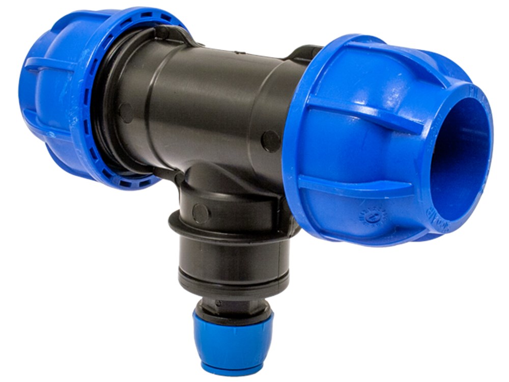 Indien de perslucht niet voldoende wordt gedroogd, kan er condensaat in het systeem ontstaan. Uiteraard is het niet gewenst dat het condensaat via de zakleidingen in het proces terecht komt. Om gebruik te kunnen maken van T-koppelingen, zonder extra toevoeging van een zwanenhals, heeft Sicomat de onderstaande serie T-verloop koppelingen ontwikkeld. De H₂O stop zorgt ervoor dat eventueel aanwezige vocht niet naar beneden kan. Deze T-verloop koppelingen zijn verkrijgbaar voor leidingdiameters Ø40, Ø50 en Ø63.