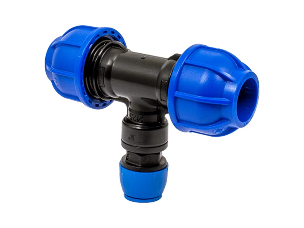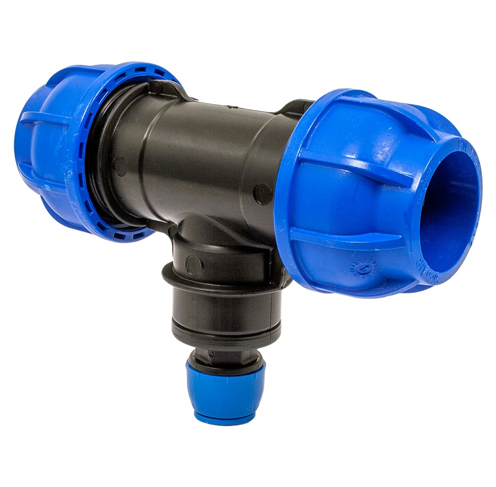 Indien de perslucht niet voldoende wordt gedroogd, kan er condensaat in het systeem ontstaan. Uiteraard is het niet gewenst dat het condensaat via de zakleidingen in het proces terecht komt. Om gebruik te kunnen maken van T-koppelingen, zonder extra toevoeging van een zwanenhals, heeft Sicomat de onderstaande serie T-verloop koppelingen ontwikkeld. De H₂O stop zorgt ervoor dat eventueel aanwezige vocht niet naar beneden kan. Deze T-verloop koppelingen zijn verkrijgbaar voor leidingdiameters Ø40, Ø50 en Ø63.