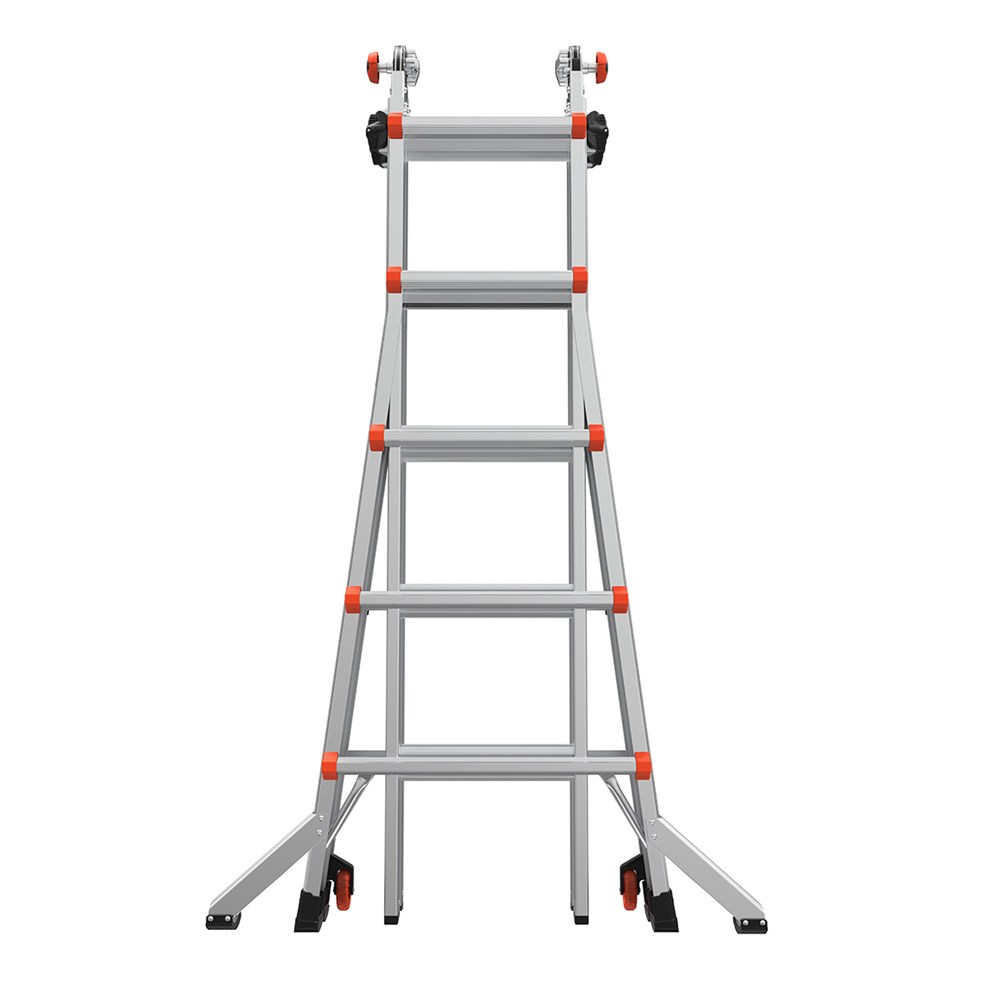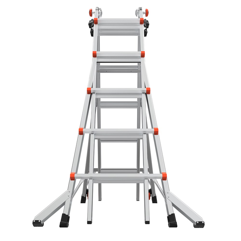 De alles-in-één multifunctionele ladder en trap voor bouw en industrie. Altijd vergrendeld in A-stand met de 4-puntsvergrendeling. Als dubbele trap, als rechte ladder met uitgebogen bomen en als steigerbok met behulp van de werkbrug. Bij ongelijk niveau en makkelijk in transport en opslag.